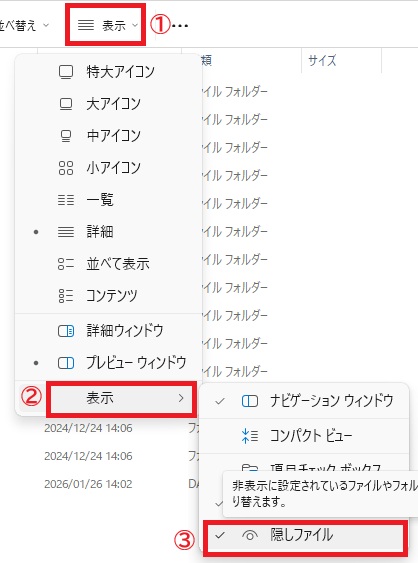 AppDataフォルダは隠しフォルダのため、表示されていない場合はエクスプローラー上部のメニューから「①表示」→「②表示」→「③隠しファイル」にチェックを入れてください。
