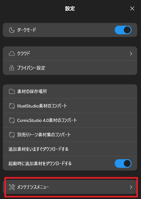 1. CLIP STUDIO START右上にある歯車マークから設定を開き、「メンテナンスメニュー」をクリック
