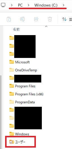 ユーザーフォルダ内にある自分が使っているユーザー名のフォルダをクリック
