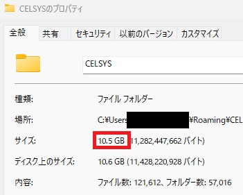 それに対し、PC内にある「CELSYSフォルダ」の容量は10.5GBあります。