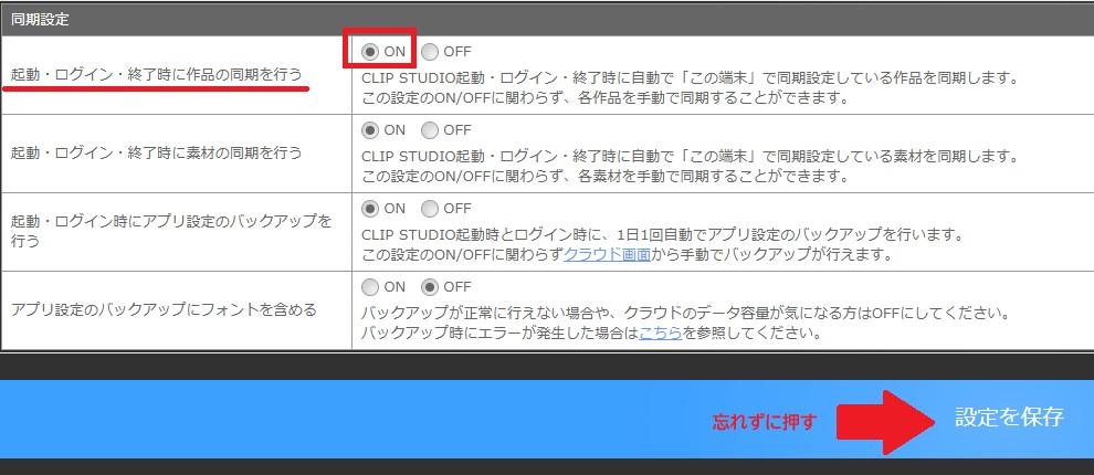 同期設定にある「起動・ログイン・終了時に作品の同期を行う」のチェックを「ON」にします👇