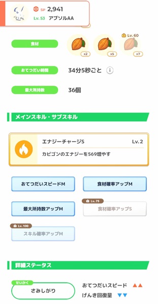 レベル75になると「食材確率アップS」が開放されるため、このアブソルは更に強くなりますね。