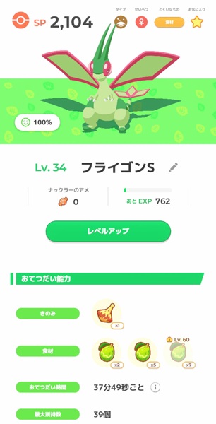 私のフライゴンは現時点でまだレベル34なので第三食材が開放されていませんが、1日手持ちに入れているとしっかりアボカドを持ってきてくれます。
