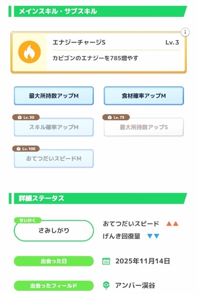 スキル確率アップMでなく食材確率アップSかおてつだいスピードMが欲しかったですが、個体値チェッカーで確認したらS個体だったのでひとまず厳選終了としました。